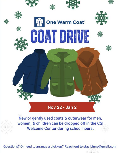 From now until January 2nd we are accepting new or gently used coats and outerwear for men, women, and children. Items can be dropped off to the Welcome Center during office hours, 7:30 AM to 4 PM. The flyer with additional details is attached. Thank you for your support.